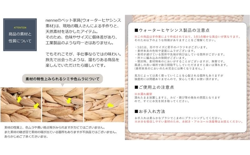 【ウォーターヒヤシンス商品の注意点】※この商品は手作業により作成されており、1点1点細かな風合いが異なります。そのため以下のような特徴がありますことをご理解ください。