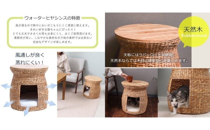 通気性が良く清潔に使えるウォーターヒヤシンス素材で猫ちゃんの安心できる居場所に。