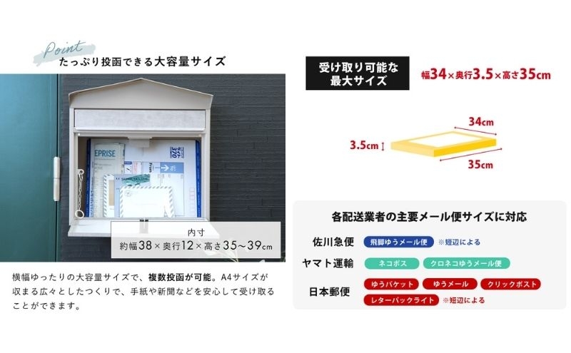 たっぷり投函できる大容量タイプで毎日の郵便受け取りが安心です。