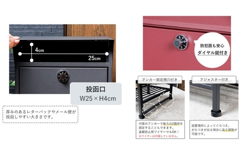 | 容量 | 1台1梱包/生産国:中国 【素材】本体:金属(スチール)、ポリカーボネート 表面加工:粉体塗装 【サイズ】 本体:(約)幅29×奥行23×高さ101cm 投函口:(約)幅25×高さ4cm 取出口:(約)幅25×高さ27.5cm 内寸:(約)幅28.5×奥行18×高さ37.5cm 【重量】 6.5kg(ブラック×ブラウン、グレージュ×モルタル) 6.0kg(ダークグレー、グリーン、レッド) 【付属品】アンカーボルト×2 【備考】お客様組立品 |