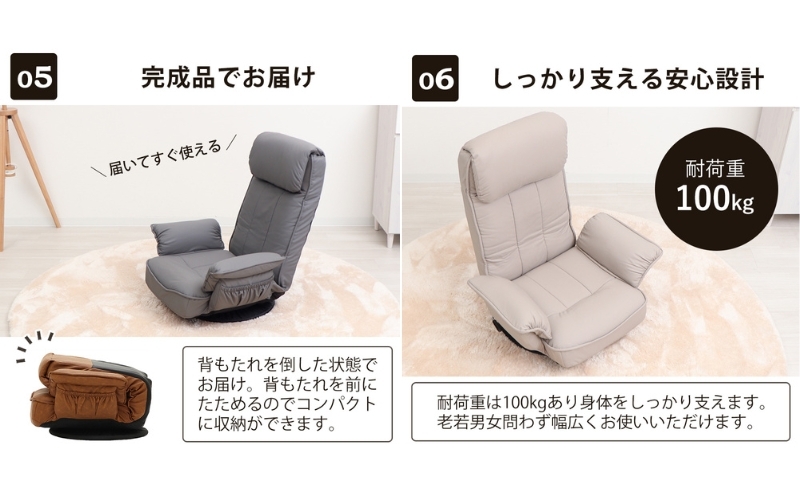 最大180度まで倒せる14段階リクライニング付きの回転盤付き・肘置き付き座椅子。