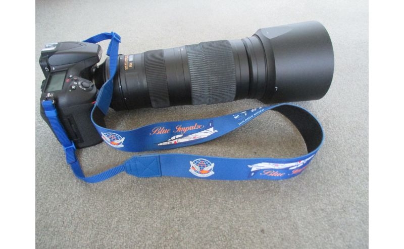 航空機フェスでカメラに「ブルーインパルス」のストラップを装着して