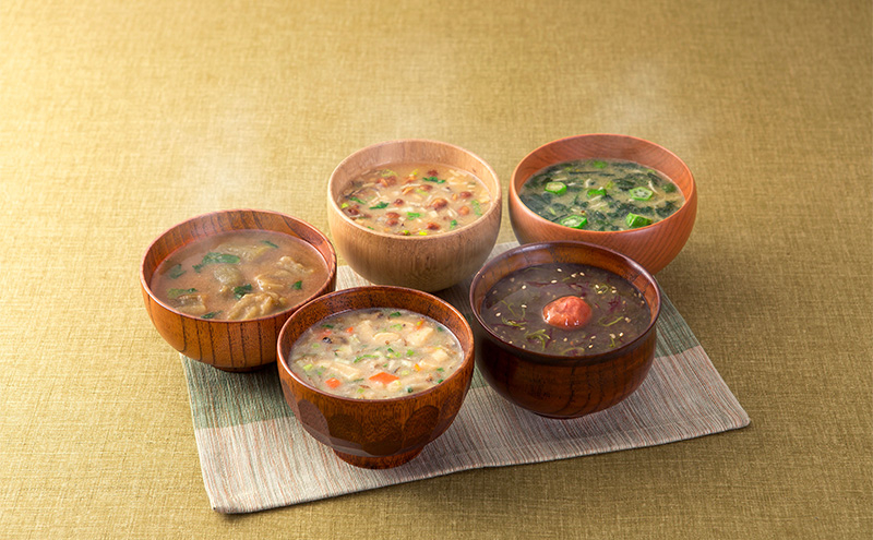 | 容量 | 海峡で育ったわかめのおみそ汁(8.4g)、ねばねば野菜のおみそ汁(10.4g)、炭火かほる焼きなすのおみそ汁(8.7g)、日本の採れたてきのこのおみそ汁(9.2g)、ごぼうがいっぱい入った豚汁(14.0g)、海藻がいっぱい入った丸ごと梅のお吸い物(6.1g) 各5食 計30食 化粧箱入り |