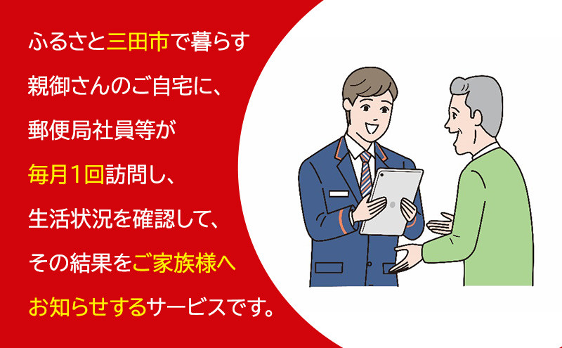 ふるさと三田市で暮らす親御さんのご自宅に、郵便局社員等が毎月1回訪問し、生活状況を確認して、その結果をご家族様へお知らせするサービスです。