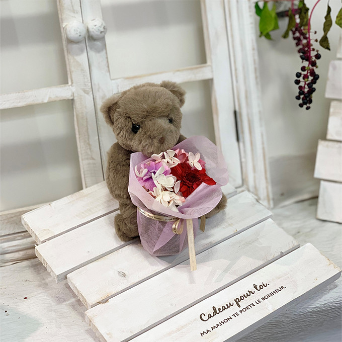 見てかわいい、さわってかわいいくまさんが、プリザのお花を抱えています。プリザーブドフラワーは、お花を長い間楽しんで頂けるように、生花に特殊加工を施しています。生花のような色合いと色の鮮やかさが特徴です