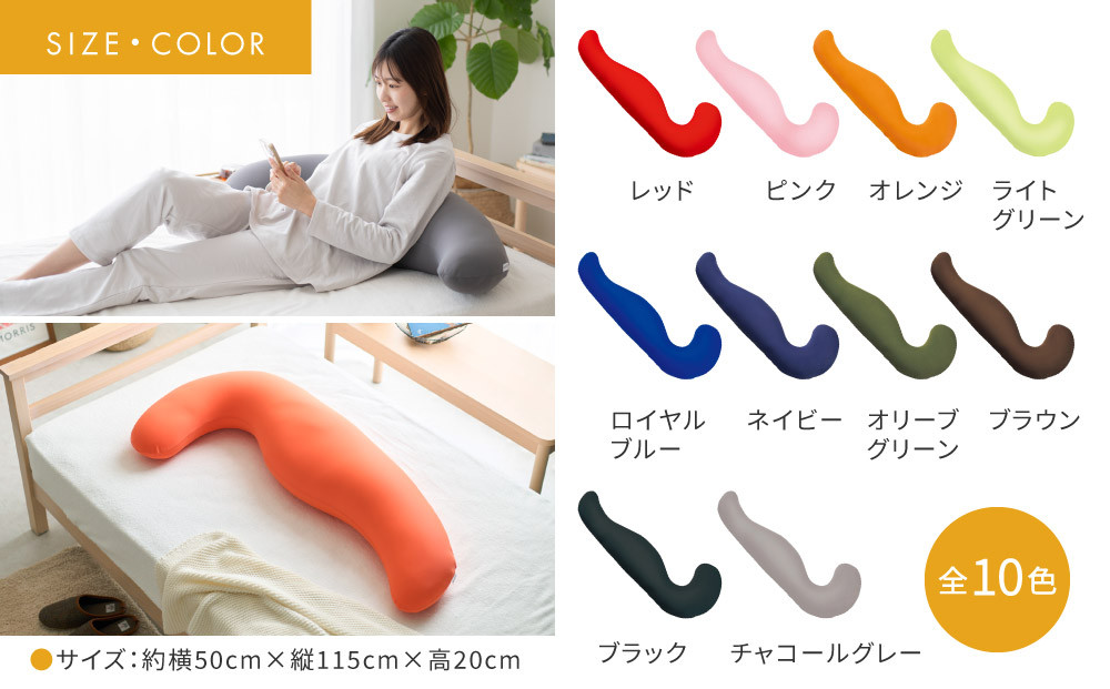 | 容量 | 気持いい抱きまくら 本体(カバー付) 【カラー】レッド・ピンク・オレンジ・ライトグリーン・ロイヤルブルー・ネイビー・オリーブグリーン・ブラウン・ブラック・チャコールグレーよりお選びください。 【サイズ】横50cm×縦115cm×高20cm 【カバー】ナイロン85% ポリウレタン15% 【本体】ナイロン85% ポリウレタン15% 【中材】パウダービーズ(発泡ポリスチレン) |