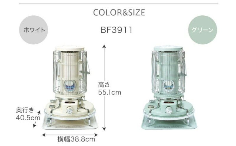 | 容量 | 品番:BF3911(W) カラー:ホワイト 本体寸法:高さ551×幅388×奥行405mm 使用燃料:灯油(JIS1号灯油) 発熱量・暖房出力:2.68kW/h(2500kcal/h) 本体重量:8.5kg(タンク空時)/11.8kg(タンク満時) タンク容量(消費量):4.1L(0.26L/h) 安全装置:対震自動消火装置 連続燃焼時間:約15時間 付属品:収納カバー、しんクリーナー ※加西市製造 |