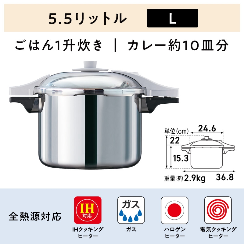 | 容量 | 【ゼロ活力なべ パスカル(L)】 ●材質/本体:ステンレス・アルミ 5層クラッド鋼、圧力蓋:ステンレス(SUS304) ●サイズ/(L)外径24.6×高さ22.0(本体高さ15.3)×最大長36.8cm ●板厚/本体:2.5mm(全サイズ共通) ●重量/(L)約2.9kg ●容量/(L)5.5L (一升炊き) ●調理圧/146kPa ●使用可能な熱源/ガス/IH/電気クッキングヒーター/ハロゲンヒーター ●取扱説明書(カラー・表紙共116頁)、オモリ、掃除棒付属 ※ 高さ、重量はすべて蓋・オモリを含む 【オールパンゼロ(26)】 ●材質/本体:アルミニウム合金・鋳造製(底厚4.7mm以上)、ハンドル:フェノール、ガラス蓋:強化ガラス、つまみ:ステンレス ●内面/ロングライフコート加工 ●外面/セラミックホーロー加工 ●サイズ/外径26×高さ7.7×最大長46.5(ハンドル取外時:最大長33.5)cm ●重量/約1.1kg 【オールパンゼロ(22)】 ●材質/本体:アルミニウム合金・鋳造製(底厚4.7mm以上)、ハンドル:フェノール、ガラス蓋:強化ガラス、つまみ:ステンレス ●内面/ロングライフコート加工 ●外面/セラミックホーロー加工 ●サイズ/外径22×高さ7×最大長40(ハンドル取外時:最大長27)cm ●重量/約0.8kg ●使用可能な熱源/ガス、IH ●ガラス蓋・取扱説明書「まいにちレシピ」付属 ※本体の高さ・重量は、蓋とハンドルを含まず 【ZKガラス蓋】 ●材質/本体:強化ガラス、つまみ:ステンレス(SUS304) ●サイズ/外径24×高さ7.5cm ●重量/ 約0.6kg 【ステンレススチーマー】 ステンレス(SUS304) 外径26×高さ4.3cm |