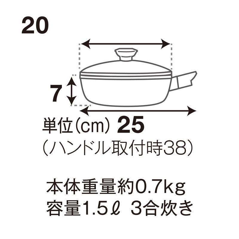 | 容量 | 【オールパンゼロ(20)シャンパンゴールド】 ●材質/本体:アルミニウム合金・鋳造製(底厚4.7mm以上)、ハンドル:フェノール、ガラス蓋:強化ガラス、つまみ:ステンレス ●内面/フッ素樹脂加工 ●外面/セラミックホーロー加工 ●サイズ/外径20×高さ7×最大長38cm・底厚4.7mm以上、ハンドル取外し時:最大長25cm ●重量/約0.7kg ●容量/1.5L ●使用可能な熱源/ガス、IH、電気クッキングヒーター、ハロゲンヒーター ●ガラス蓋・取扱説明書「まいにちレシピ」付属 ※本体の高さ・重量は、蓋とハンドルを含まず |