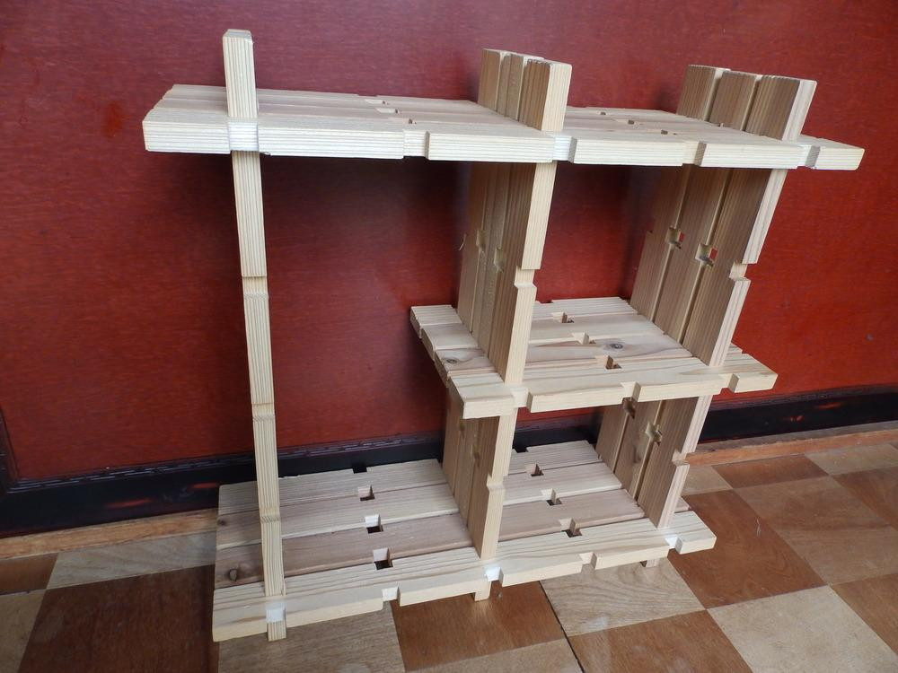 お送りする組手什キットで、ネジ・クギや接着剤を使うことなく、溝と溝を交互にはめ込むことで、木の温もりと香り豊かな飾り小棚が完成できます。
