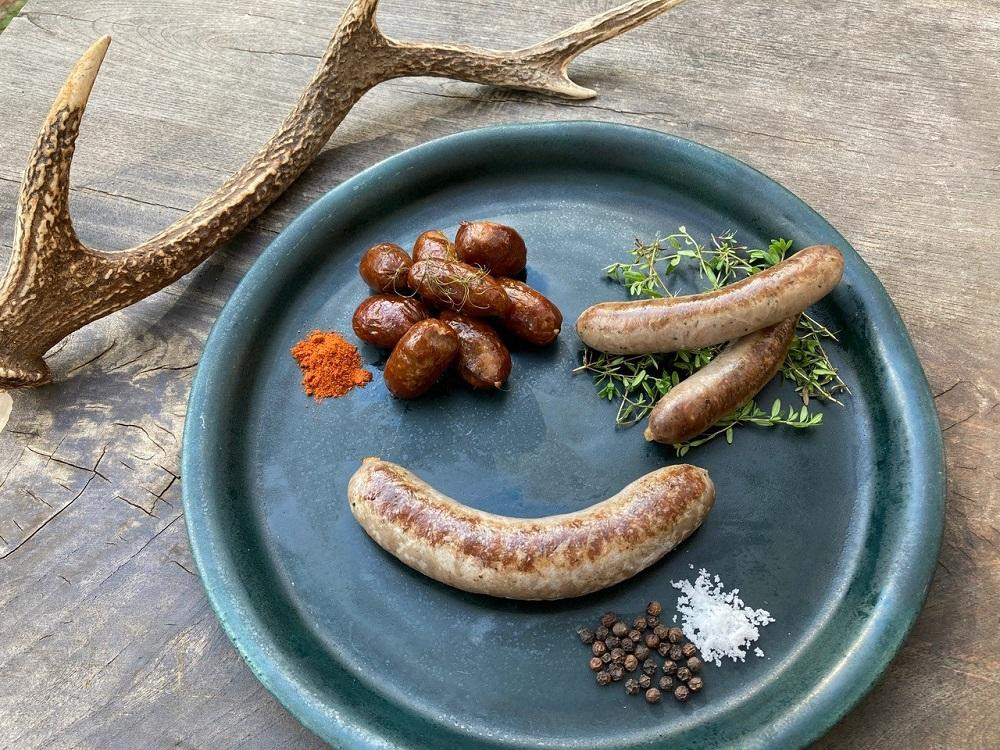 丹波篠山市内で捕獲された野生鹿肉贅沢に使った4種のソーセージセット。