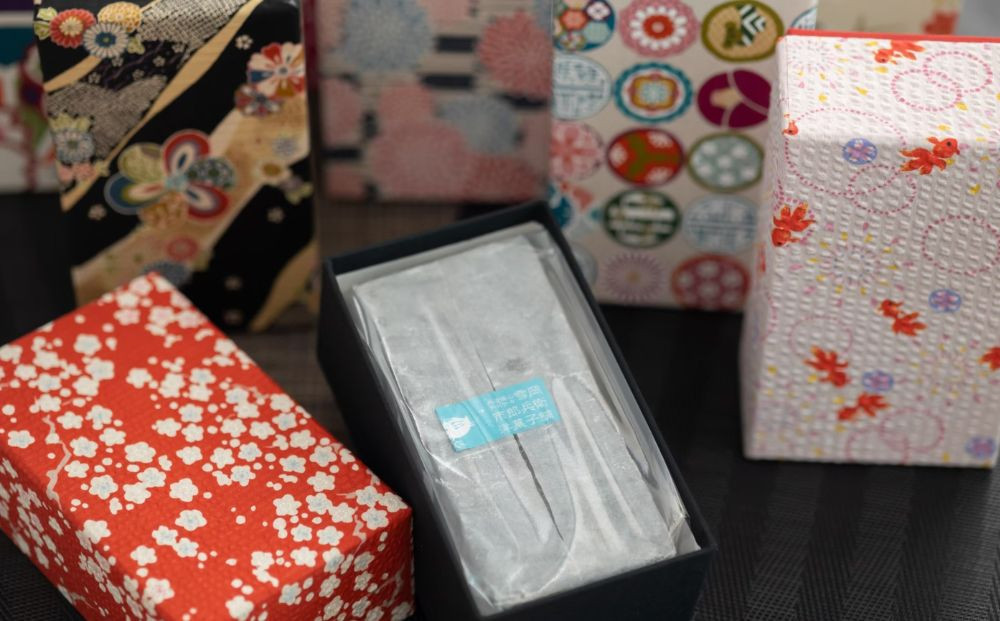 京都の老舗箱屋さんで作ってもらった京友禅柄の布貼箱に入っていて贈答品や自分へのご褒美にも最適です。