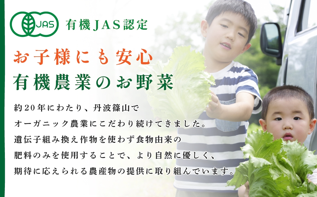 兵庫県丹波篠山の中末農園が育てた、有機JAS認定を受けたお野菜詰め合わせです。季節に応じて、有機野菜8種類〜12種類120サイズの大きな箱に詰め合わせをお送りいたします。