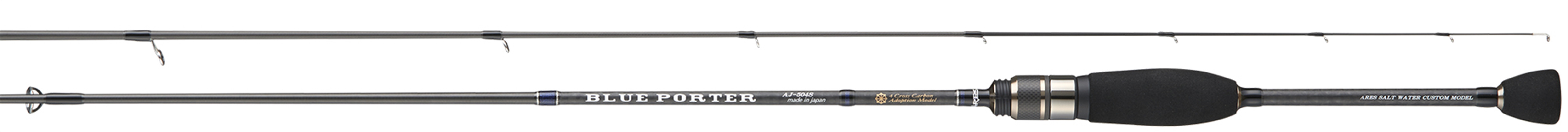 BLUE POTERシリーズのアジング専用ロッドのAJ 。穂先には高弾性ソリッドを搭載し、繊細なアタリをも逃さない高感度と、曲がりに対しても高い強度を実現。シートには、手にしっかりフィットするIPSシートを採用。