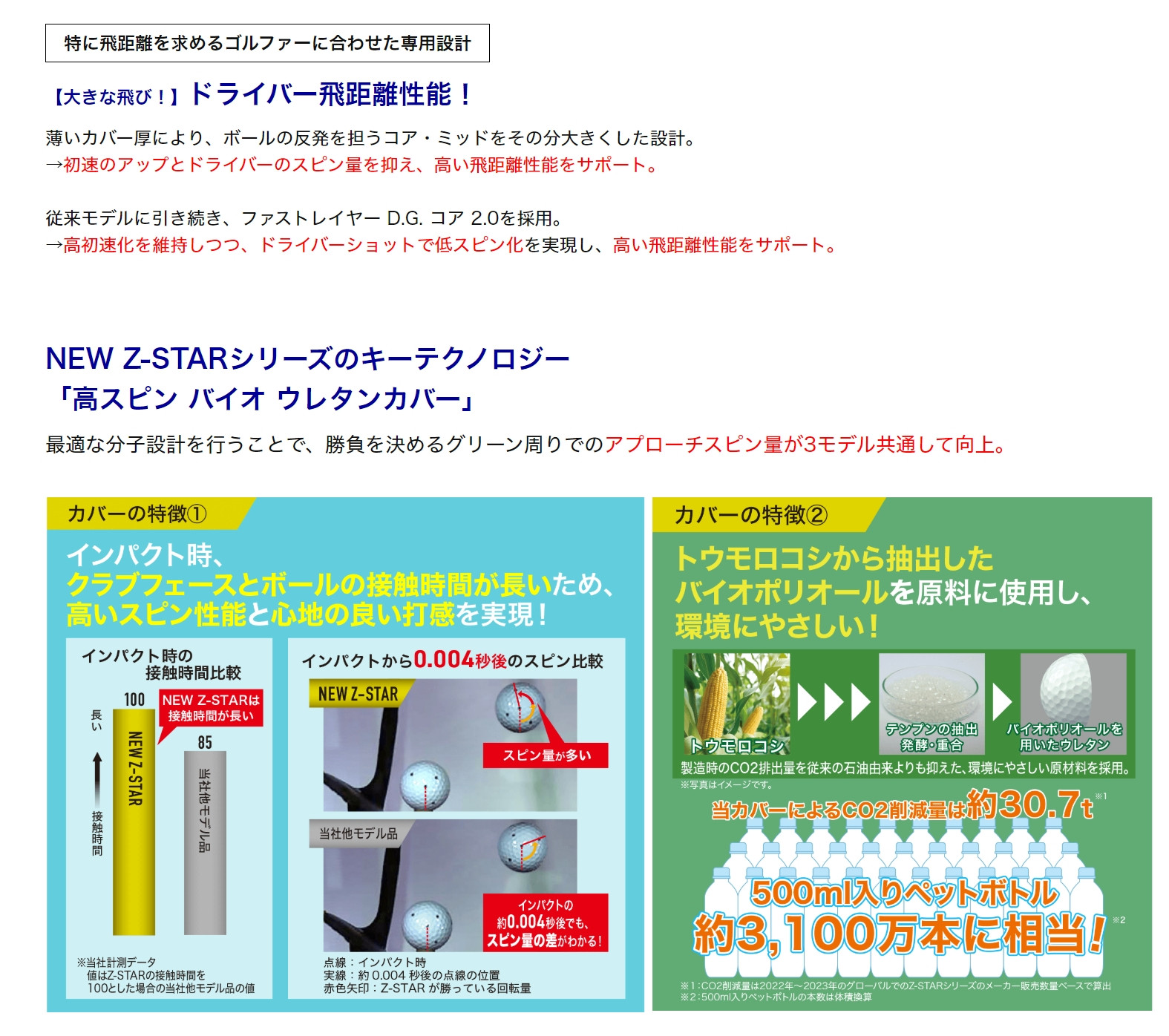 Z-STARシリーズの中で、高いスピン性能を維持しつつ、ドライバーでの初速が最も速い設計のため、ツアーボールの中で、特に飛距離を求めるゴルファーにピッタリ!