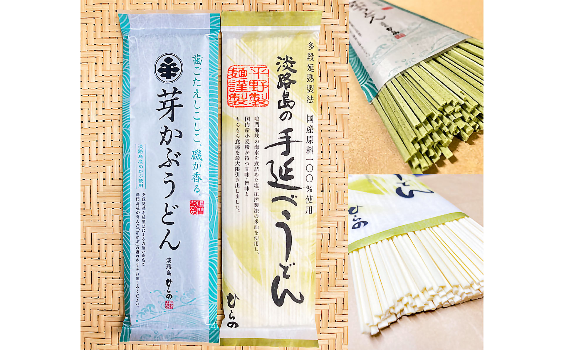 「芽かぶうどん」は鳴門海峡産の芽かぶを練り込んでいるので、磯の香りが広がって、しこしこした食感が楽しめます。「淡路島の手延べうどん」は国内産小麦粉、地元鳴門海峡の海水を煮詰めて作った塩、日本で1社しか製造していない、国産米ぬかを昔ながらの圧搾製法で作った米油を麺に塗布し、素材が持つ「ぷりっぷりでもちもちとした食感」「甘み・旨味」を最大限に引き出しました。どちらの商品も全国的に珍しくなった昔ながらの職人の丁寧な手仕事「小引き」「門干し」を行い、手間暇惜しまず4段階の延ばし作業、6度の熟成を行い12工程・約40時間掛けて作る独自の「多段延熟手延べ製法」で作り上げています。手仕事でしか味わえない力強い食感と、艶やかなのど超しをお楽しみいただけます。