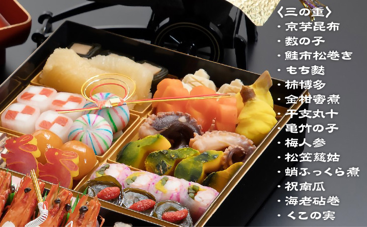 | 容量 | ■一の重 紅白蒲鉾 海老艶煮 松笠烏賊 小川造里 鮑ふっくら煮 結び牛蒡 鮎甘露煮 蛇籠蓮根 鰆塩麴焼 祝丸十 ボタン百合根 ■二の重 千社頭 金箔黒豆 子持昆布 氷頭膾 針柚子 紅白丁呂木 いくら正油漬け きんとん 栗甘露煮 田作り 菊花蕪 たかの爪 堀川牛蒡 ■三の重 京芋昆布 数の子 鮭市松巻き もち麩 柿博多 金柑蜜煮 干支丸十 亀竹の子 梅人参 松笠慈姑 蛸ふっくら煮 祝南瓜 海老砧巻 くこの実 |