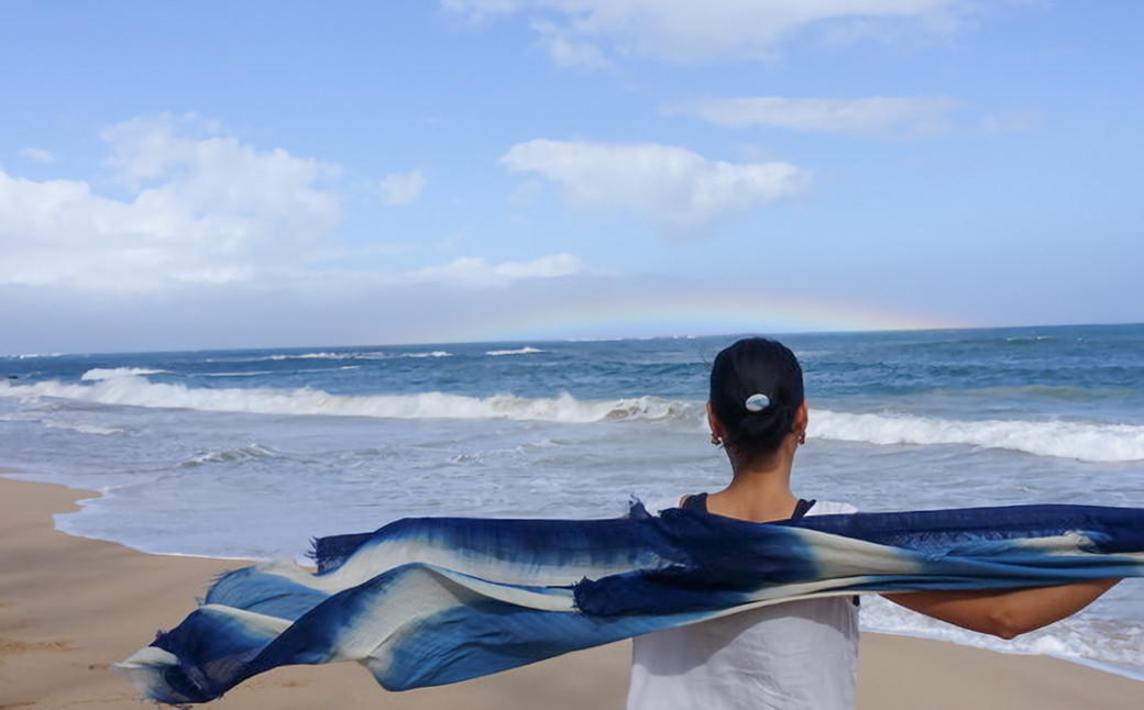 自家栽培の“おのころ藍”で、日本古来の発酵による藍染をしています。 藍には抗菌、防臭作用があり、お肌が弱い方にもおすすめ。 大判ですので、お洒落着から赤ちゃんのおくるみまで幅広くお使いいただけます。