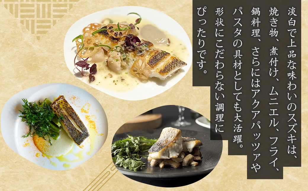 淡白で上品な味わいのスズキは、焼き物、煮付け、ムニエル、フライ、鍋料理、さらにはアクアパッツァやパスタの具材としても大活躍。形状にこだわらない調理にぴったりです。