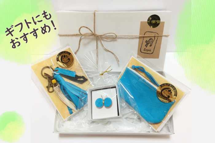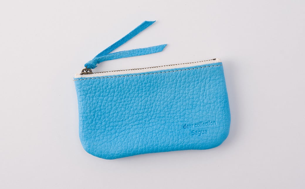 山を守るニホンジカを、宍粟の山に無害の革に仕上げ、美しく形にした作品です。 AN13 鹿革コレクション「生きた証」露草 3点セット 【 ポーチ タッセル チャーム 鹿革 革製品 小物入れ 小銭入れ カードサイズ オーガニック 蝶 チョウ 手作り つゆくさ 青 ブルー 水色 】