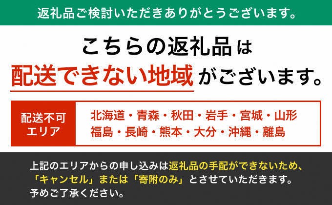 ※上記のエリアからの申し込みは返礼品の手配が出来ないため、「キャンセル」または「寄附のみ」とさせていただきます。予めご了承ください。