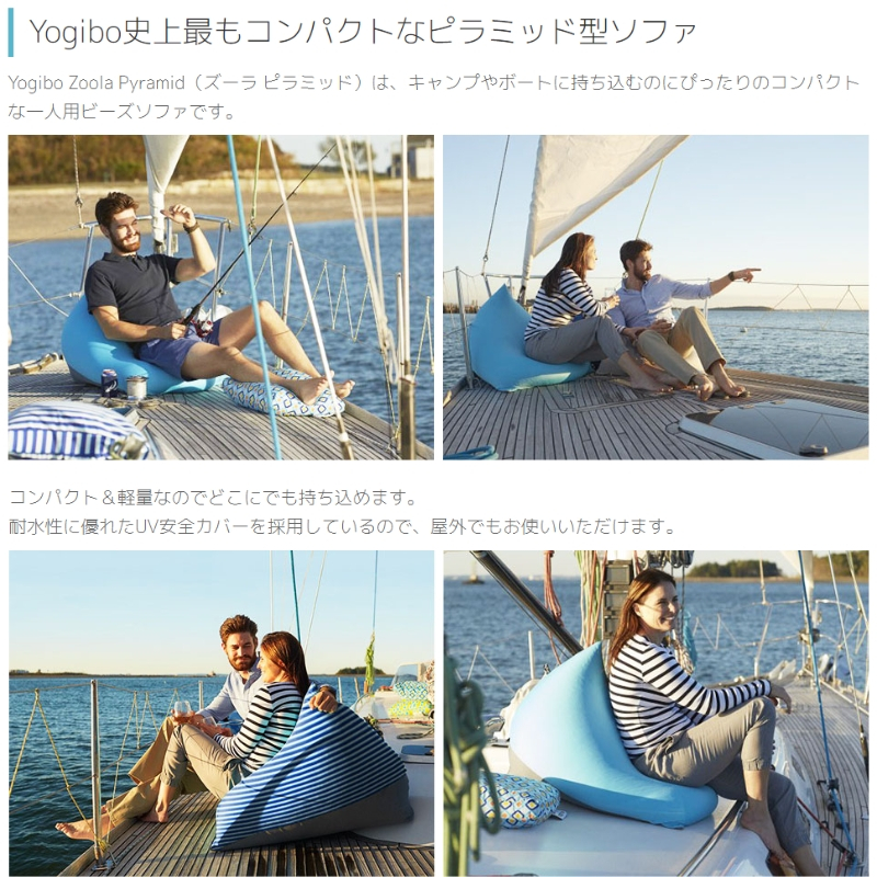 Yogibo Zoola Pyramid(ズーラ ピラミッド)は、キャンプやボートに持ち込むのにぴったりのコンパクトな一人用ビーズソファです。