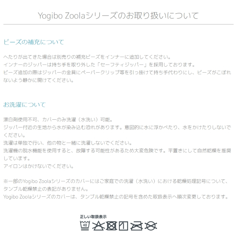 ※新品のYogiboは、新しいビーズ特有の科学的なにおいがすることがありますが、人体に害のあるもの ではございません。通常、数日~1ヶ月ほどでにおいはなくなりますが、においが 気になる場合は風通しの良い場所にしばらく置いてください。