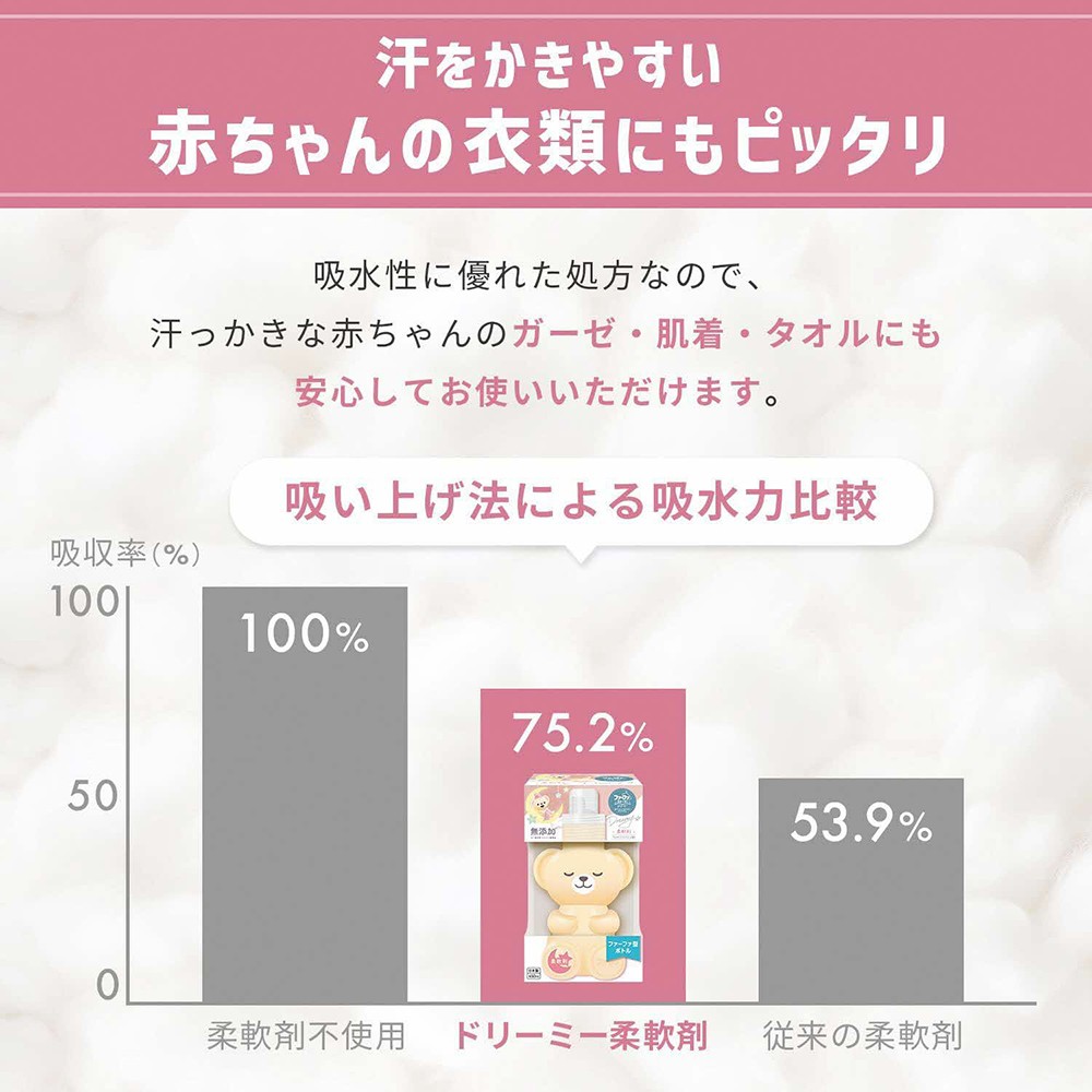 ●吸水性に優れた処方なので、汗っかきな赤ちゃんのガーゼ・肌着・タオルにも安心してお使いいただけます。
