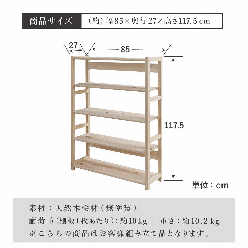 | 容量 | セット内容:本体×1※お客様組み立て品 サイズ:約高さ117.5×幅85×奥行27cm 質量:10.2㎏ 耐荷重:約10㎏(棚板1枚当たり) 素材:天然木桧材(無塗装) |