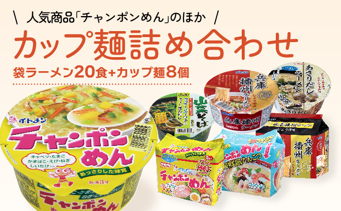 人気商品「チャンポンめん」のほか、「兵庫播州らーめん」などの袋ラーメン20食とカップ麺8個の詰め合わせをお届けします。