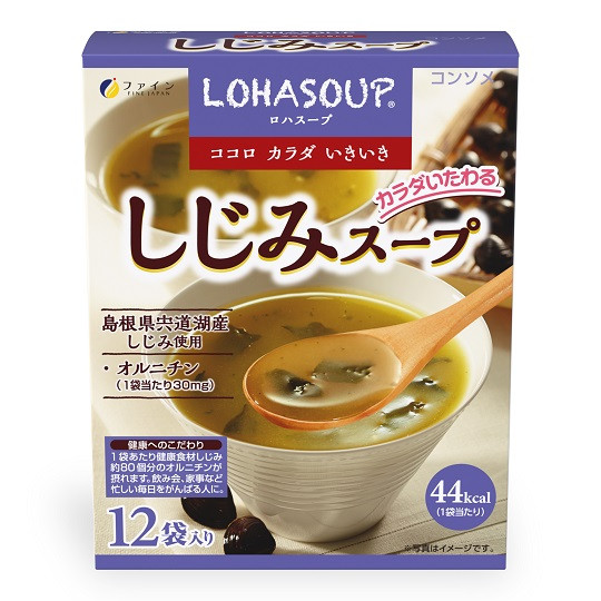 ●本品は島根県宍道湖からとれたしじみを使用したしじみエキスを主成分とし、これにカキ抽出物と酵母エキスを加えて作られた健康スープです。