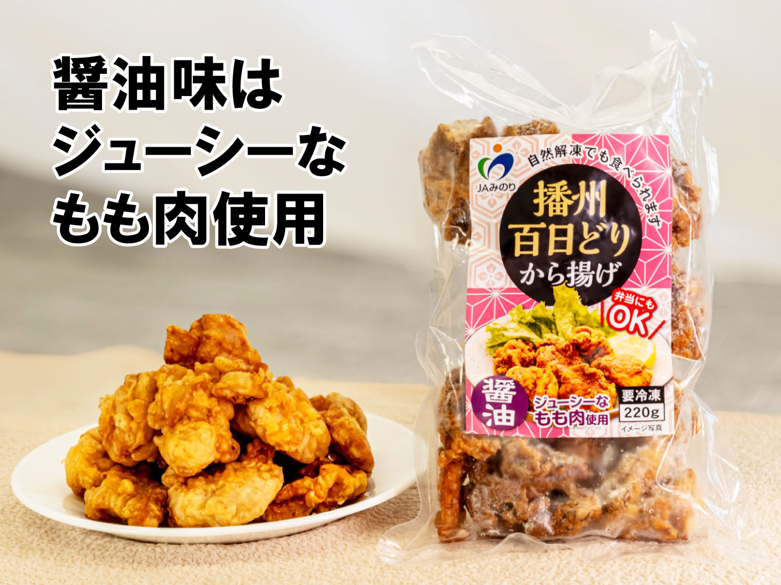 醤油味はもも肉使用でジューシーです。塩味は手羽元肉使用で弾力があります。どちらも旨味いっぱいでおいしいです。太陽の光をいっぱい浴びて自然に近い環境でおよそ100日間育てた播州百日どりのから揚げです。