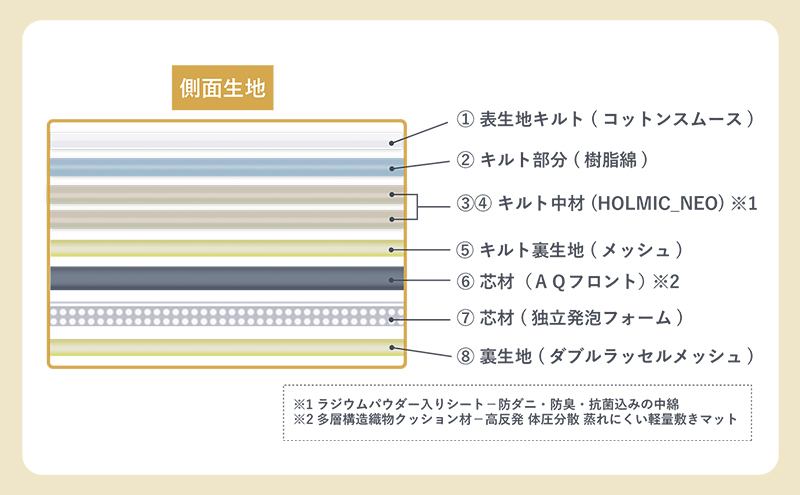 | 容量 | ~本体敷きマット~ ・サイズ:縦201cm 横97cm 厚み4.5cm ・素材 表生地:コットンスムース(綿100%) 裏生地:ミルキーメッシュ(ポリエステル100%) 中材:ポリエステル綿+ホルミシス素材2枚(ポリエステル100%) AQマット(高反発素材):ポリエステル100% フォームエース:発泡ポリエチレン 底生地:ダブルラッセルメッシュ(ポリエステル100%) ~専用カバー~ ・サイズ:縦204cm 横97.5cm 厚み(本体を入れて)5cm ・素材 表生地:綿サテン(綿100%) 裏生地:ブロード生地(ポリエステル80%、綿20%) *日本製 ※詳細はHPをご覧ください。 |