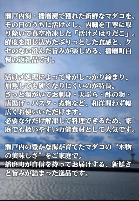 瀬戸内海・播磨灘で獲れた新鮮なマダコを、その日のうちに活け〆し、内臓を丁寧に取り除いて真空冷凍した「活け〆はりだこ」。