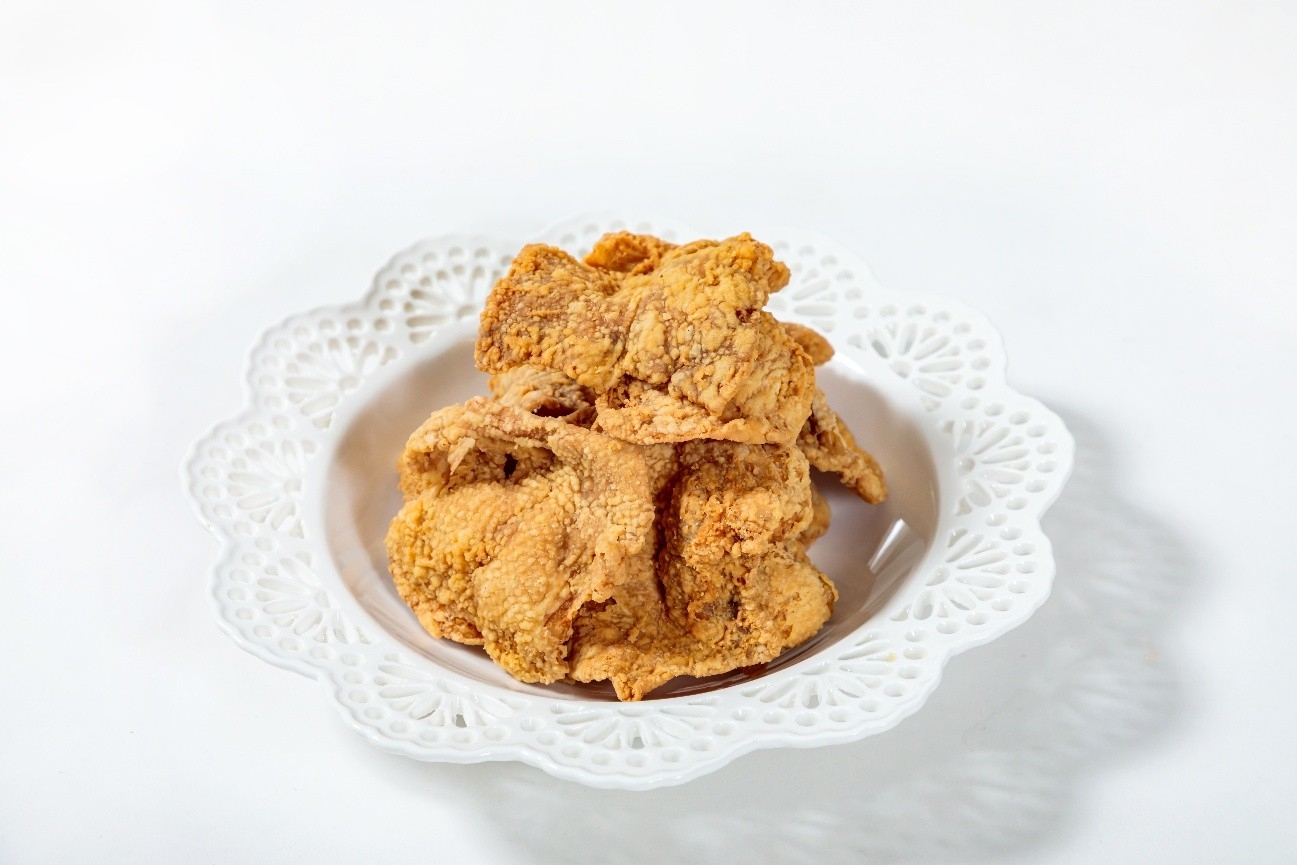 低温でじっくりと揚げる事でコラーゲンをギュッと中に閉じ込めサクサクパリパリ食感に仕上げています。