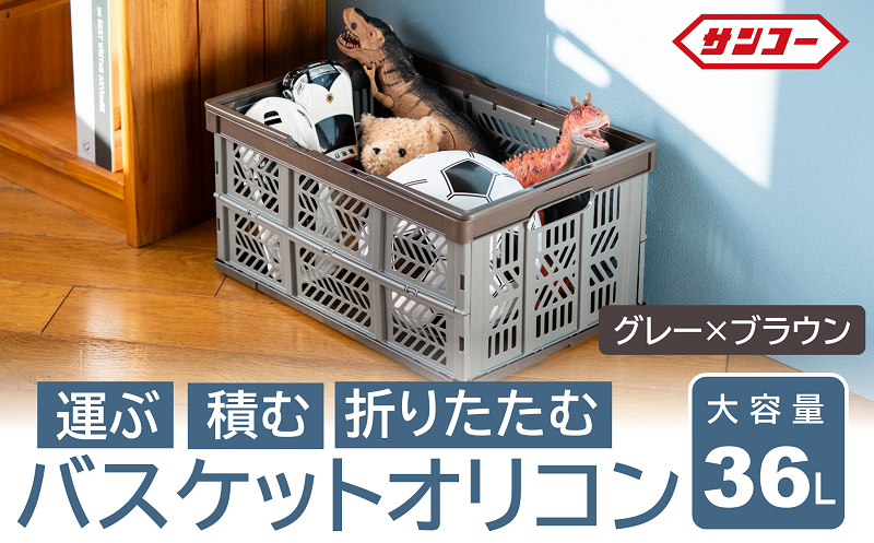 【折りたためる】エコンバスケットオリコン(グレー×ブラウン)018SK01N./折りたたみ バスケット ハンドル付き かご 小物 収納 プラスチック 持ち手 アウトドア 洗える 折りたためる 買い物カゴ コンテナ ボックス コンパクト 積み重ね 整理 スタッキング アウトドア DIY 工具 サンコー