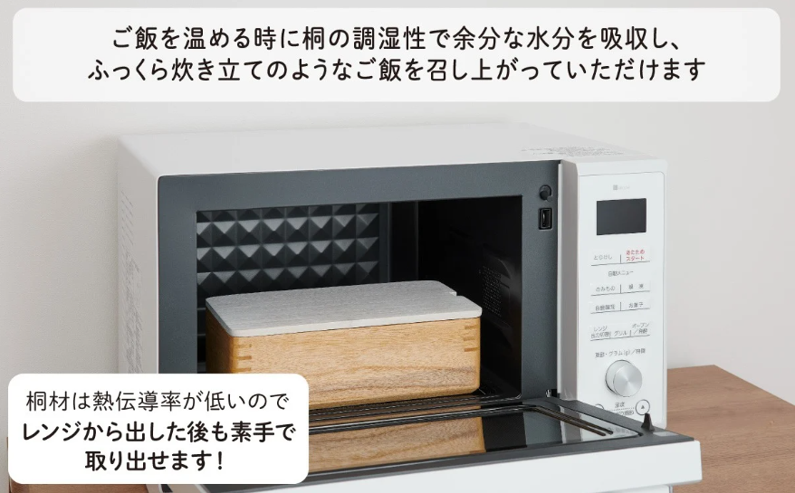 桐の特性である熱伝導率の低さを活かし、レンジで温めた直後でも本体が熱くなりにくくレンジから直接出して食卓に持っていけます。