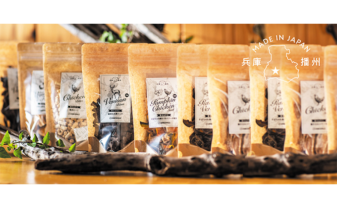 | 容量 | ・鹿肉のふりかけ:25g 素材:鹿肉 ・鶏肉のふりかけ:25g 素材:鶏肉 ・りんごスティック:30g 素材:りんご ・季節の野菜と果物:40g 素材:りんご、かぼちゃ、にんじん、さつまいも |
