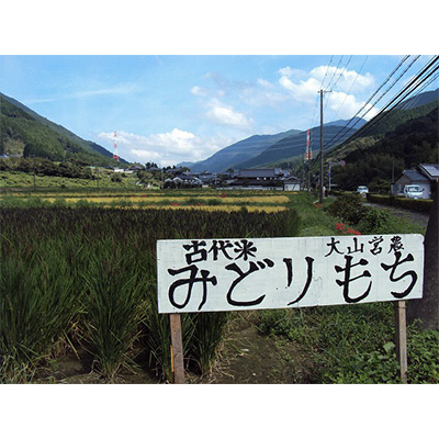 播磨但馬の国境、山間部の集落神河町大山の澄み切った水おいしい空気の中で栽培した古代米のみどり餅米をご賞味ください。