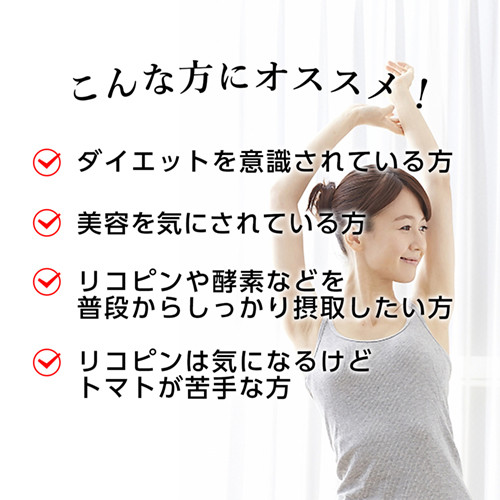 ●「トマトが赤くなると医者が青くなる」という伝承のように、トマトは栄養価の高い野菜です。本品は、完熟生食用トマトなら約7個分、加工用トマトなら2~3個分に相当するリコピンを贅沢に配合しています。
