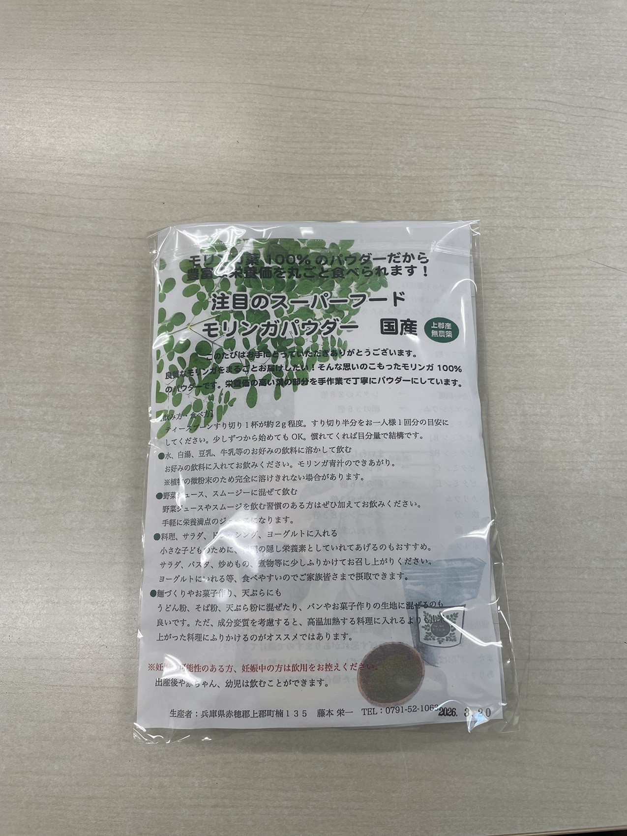 上郡産モリンガ100%使用! 自然の恵みをそのまま粉末に 上郡で大切に育てられたモリンガを、100%粉末化。モリンガ本来の風味をしっかり感じられる、自然派の健康ドリンクです。 飲みやすさにもひと工夫 小さじ1杯を100mlの水に溶かすだけ。 少量のお水でよく混ぜてから、残りの水を加えるとダマになりにくく、スッと飲みやすくなります。 朝の1杯に、日々のリセットタイムに、ぜひお試しください。 ■生産者の声 ~モリンガ成分を活かしたスキンケア商品製造にチャレンジします!~ 私たち「上郡町モリンガの里プロジェクト」は、兵庫県上郡町でモリンガを栽培されている藤本栄一さんと町を元気にしたい!と話し合っていろんな方の力をお借りし、モリンガパウダー等を商品開発しています。