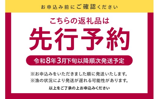 季節限定の返礼品は、漁や収穫の状況により、発送時期が目安よりも大きくずれ込む場合がございますので、ご理解いただきますようお願いいたします。