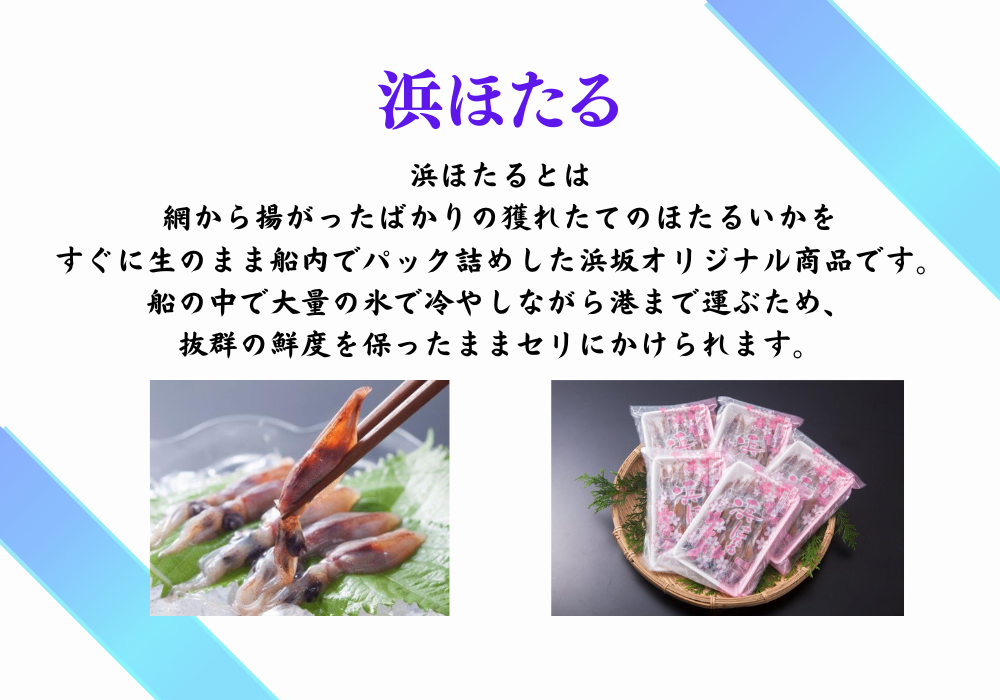 ほたるいか水揚げ日本一を誇る兵庫県(※)にある浜坂港より新鮮な生ほたるいかをお届けします。鮮度の良い状態でお刺身、しゃぶしゃぶ、釜揚げなどさまざまなお料理に使えます。ぜひこの機会にお食べください。