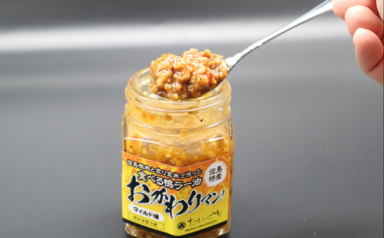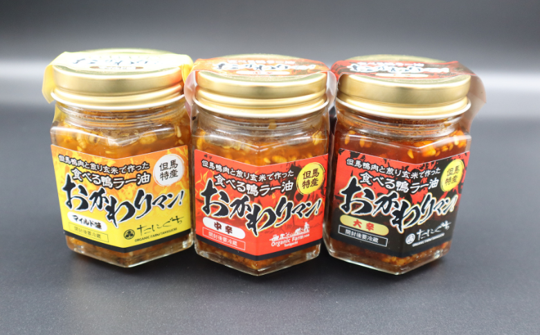 但馬鴨肉をたっぷり使用した贅沢な食べるラー油を、マイルド味、中辛、大辛の3種で楽しめる食べ比べセット。