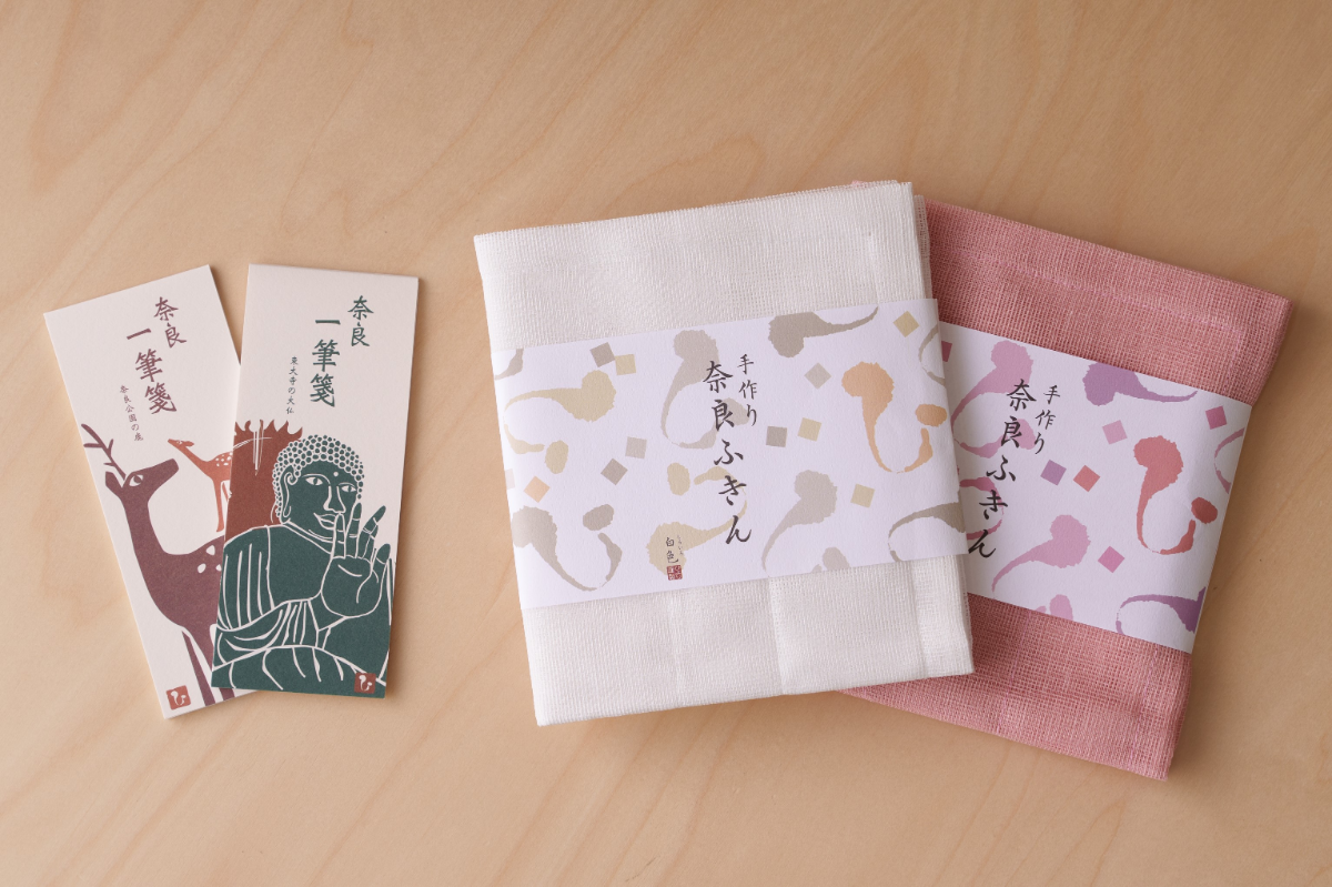 一筆箋のデザインのお洒落さと可愛らしさが好評です。また、奈良ふきんはご愛用・リピートの方も多い人気商品です。
