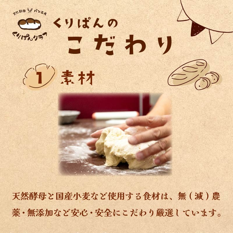 くりぱんクラブのパンの基本材料は、国産小麦・天日塩・天然酵母。小麦粉をはじめ、使用する食材は無(減)農薬・無添加など安心安全にこだわり厳選しています。