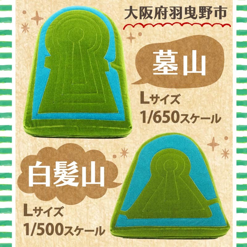 -規模(サイズ)- 全長660mm/前方部幅480mm/後円部径450mm/墳丘の高さ110~125mm -表面材質(生地)- ソファなどに使われる、椅子張り専用の生地「モケット(AC65% RY20% PE15%)」を使用。 -内部構造(クッション)- ソファなどに使われる、密度・硬さの異なるウレタン、ウレタンチップの三層版築構造。 通常のクッションとは異なり、硬めで非常にしっかりした仕上がりとなっています。 -築造方法- 椅子張替え職人が一基一基全ての工程をひとりで手作りしています。 -築造時の美しい外観を保つために- 柔らかいブラシで毛の順目方向にそってブラッシングしてください。 モケット地は毛の順目方向にそって拭きます。 汚れが目立つ場合は、ぬるまゆで300~400倍に薄めた中性洗剤に布を浸し、 固く絞って汚れを拭き取ってください。 その後、よく水拭きしてから柔らかい布で乾拭きしてください。 -古墳クッションを愛でる上でのご注意- 洗濯は生地の性質上おやめください。 また、ファスナーを開けてカバーを取られますと復元困難となります。お気をつけください。