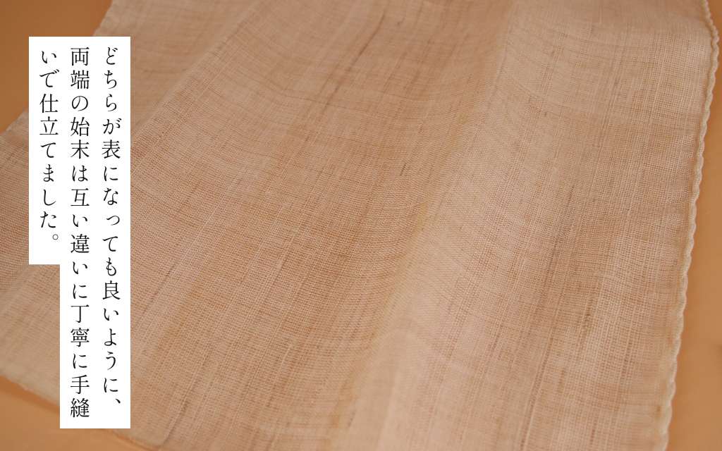 どちらが表になっても良いように、両端の始末は互い違いに丁寧に手縫いで仕立てました。