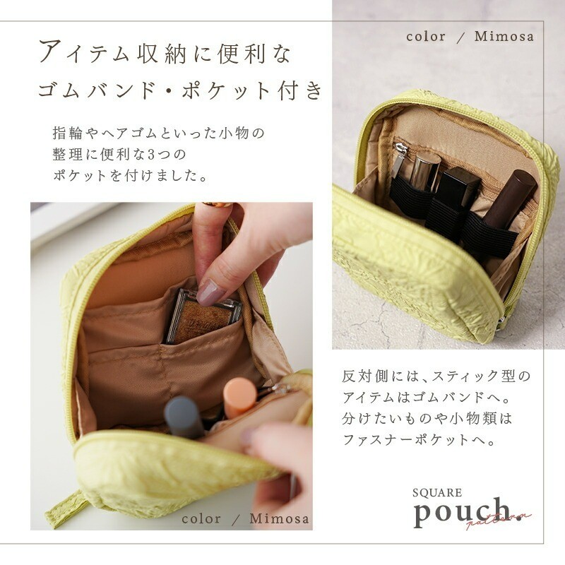 | 容量 | サイズ Sサイズ:11.5cmx11.5cmx4.5cm Mサイズ:14.5cmx14.5cmx5.5cm ※ポケットのサイズなど詳しいサイズは画像をご参照ください。 |