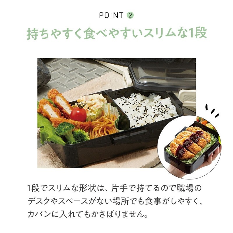 | 容量 | 1段 【商品サイズ(約)】 ランチボックスサイズ:224×128×63mm ランチバッグサイズ:238×133×75mm 容量:830ml 弁当箱の重さ:235g 総重量:280g(ランチバッグ含む) 【品質表示】 フタ:AS樹脂(耐熱温度100度) 本体・止具・仕切:ポリプロピレン(耐熱温度140度) パッキン:シリコーンゴム(耐熱温度140度) ランチバッグ材質 表地:ポリエステル 中材:発泡ポリエチレン 裏地:アルミ蒸着フィルム 使用抗菌剤の種類:無機抗菌剤 加工方法:練込 加工部位:全体(ランチバッグ除く) |